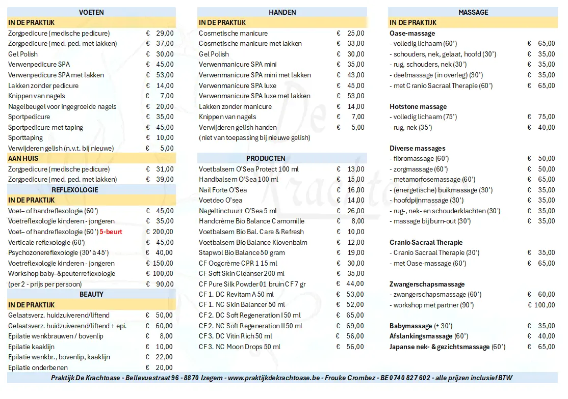 Meer info bij jouw gespecialiseerde voetverzorger (medische pedicure) Frouke. Voor de producten is er de klantenkaart. Cadeaubon is steeds mogelijk.